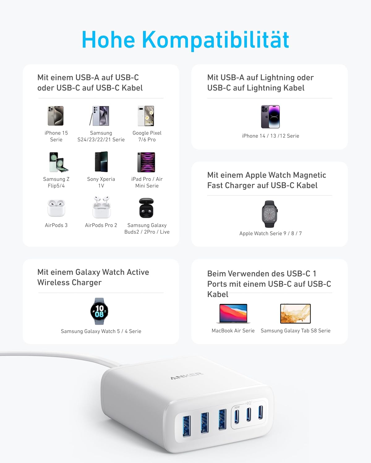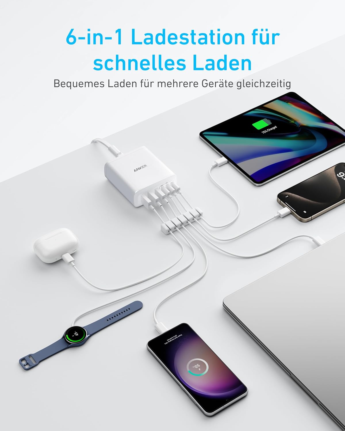 - 6-in-1 Ladegerät für alles: Entwickelt für moderne Bedürfnisse, versorgt dieses Ladegerät deine gesamte digitale Ausrüstung, von Laptops bis Smartphones, gleichzeitig mit Strom. Hinweis: 30W Laden ist auf den USB-C1-Port für das MacBook Air beschränkt.