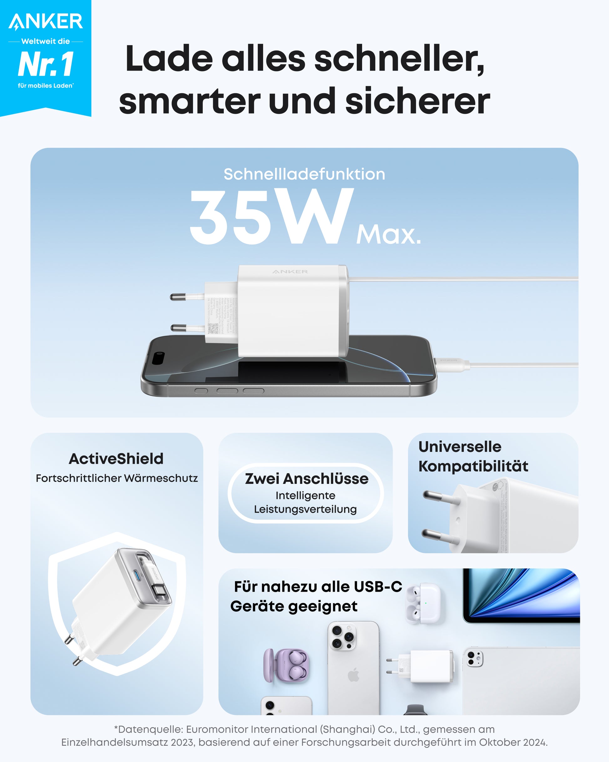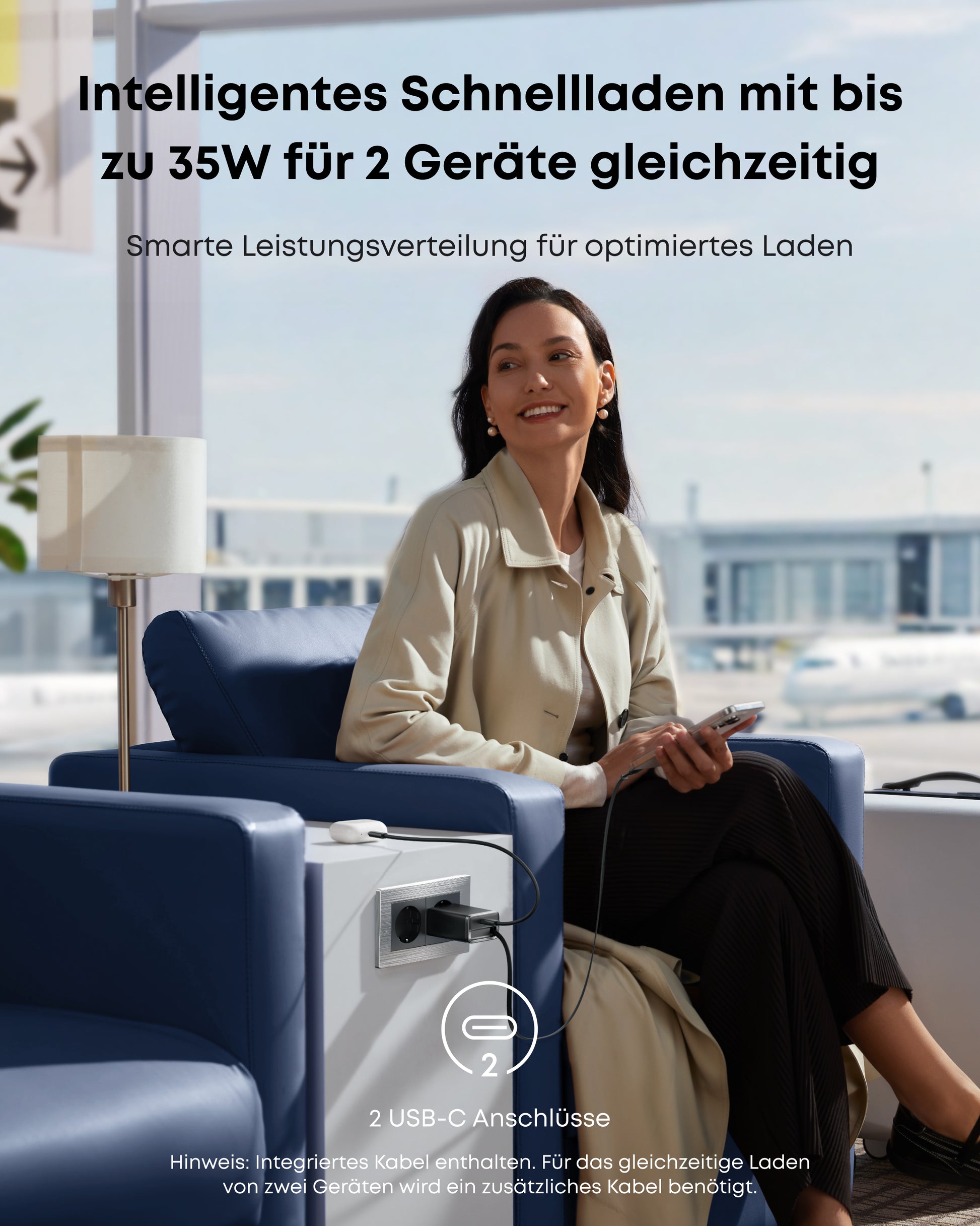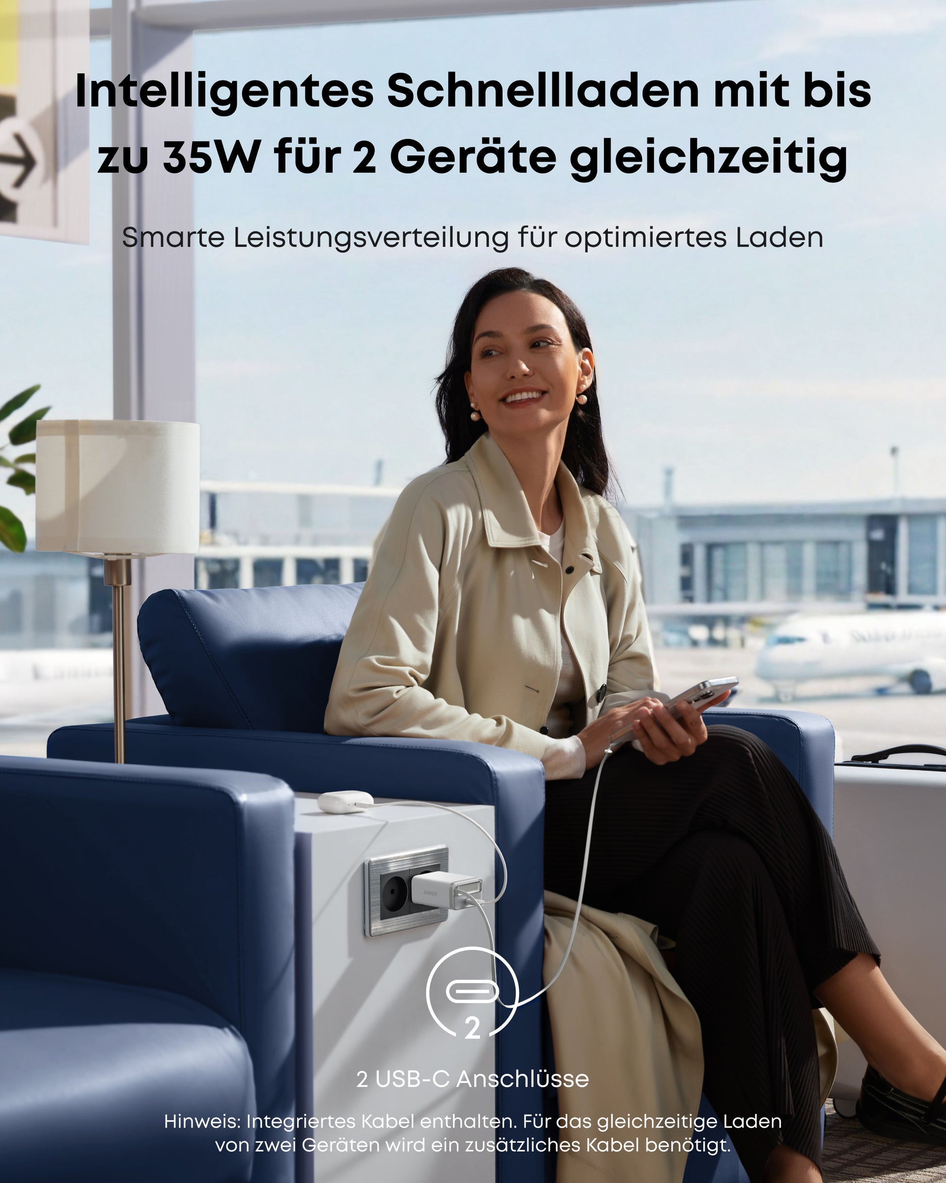 Intelligente 35W Power mit zwei USB-C Ports: Zwei Anschlüsse, smarte Energieverteilung – für effizientes Laden ohne Kabelsalat. Der perfekte Ersatz für mehrere Ladegeräte im Alltag.