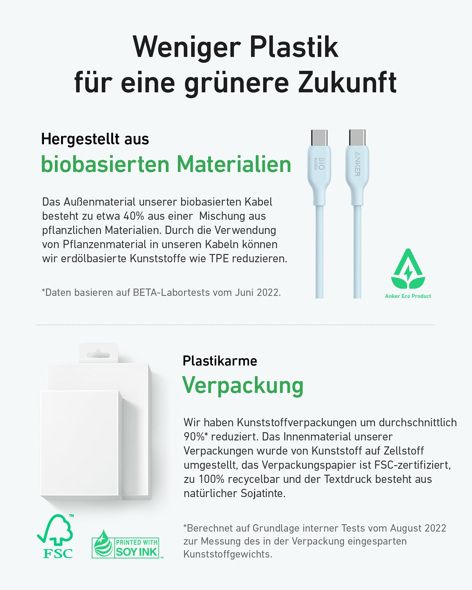 WAS DU BEKOMMST: Anker 543 USB-C auf USB-C Kabel (Bio, 90cm), 24 Monate Herstellergarantie sowie freundlichen Kundenservice.