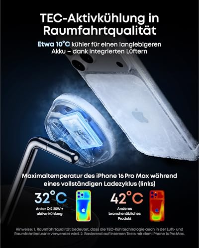 - Aerospace-Grade TEC Active Cooling: Thanks to TEC active cooling, your phone stays below 89°F while charging, providing a safe, efficient, and comfortable experience. Lower temperatures help protect your battery's health and reduce long-term degradation. Actual performance may vary.