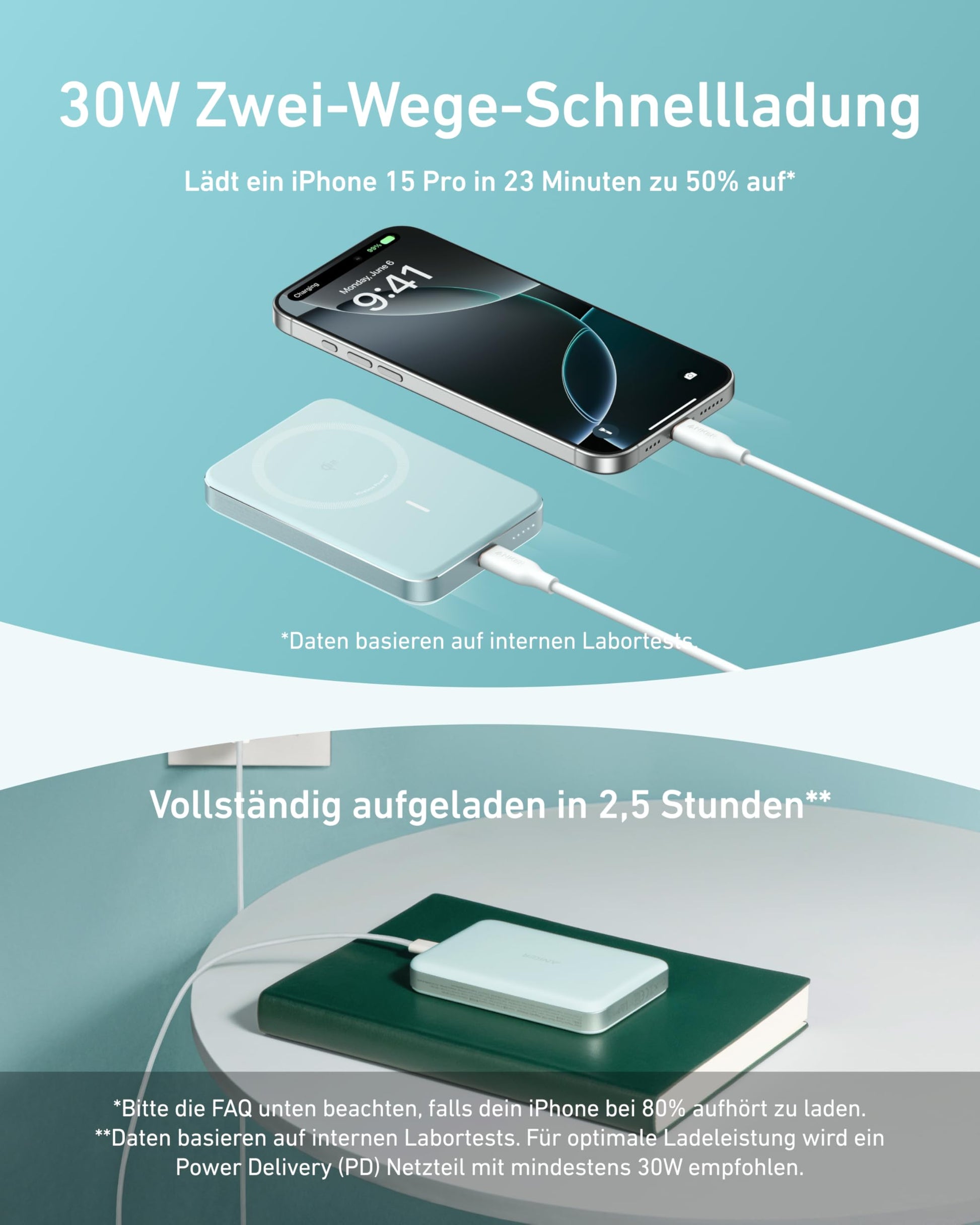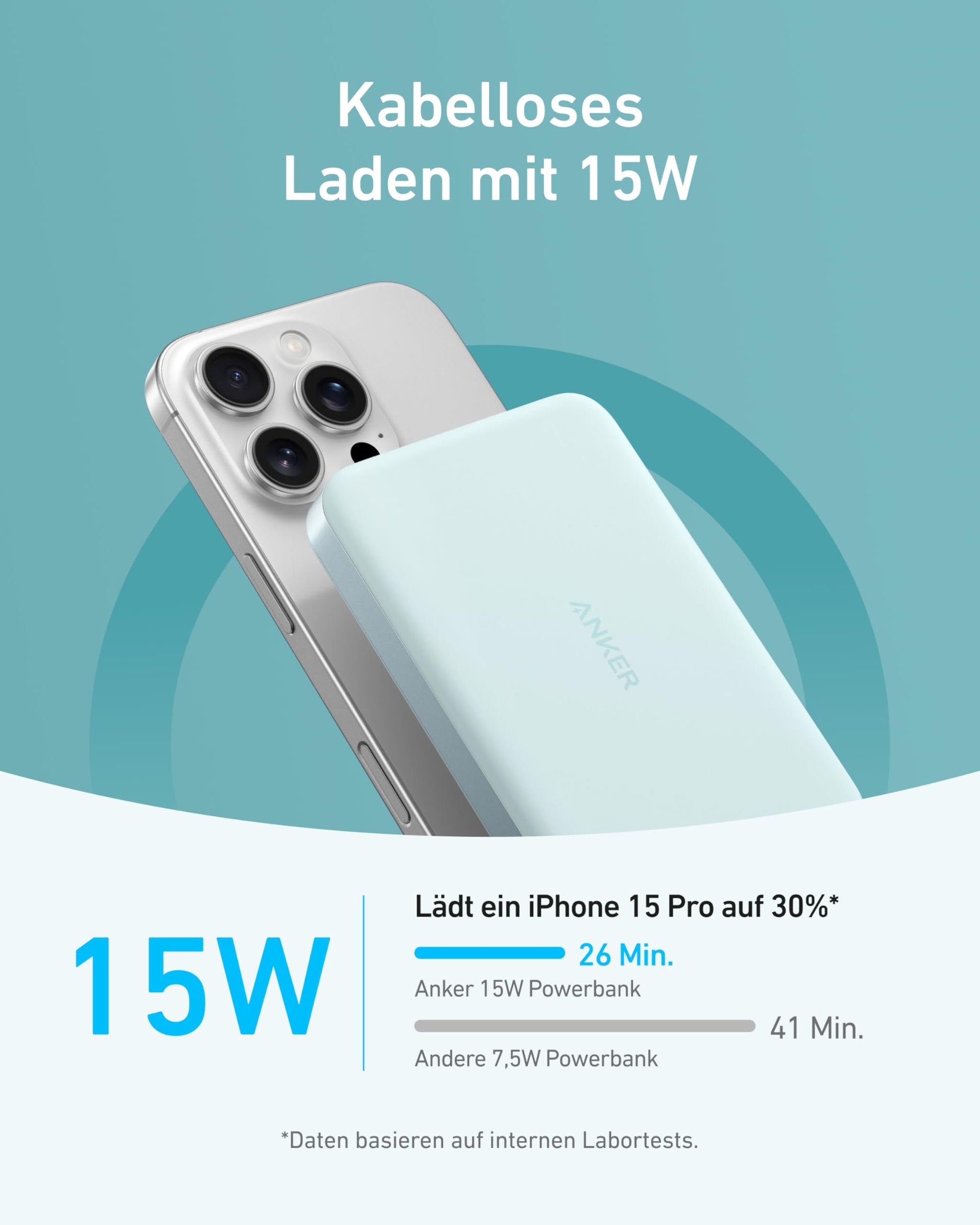 Ultra-schnelles, kabelloses Laden mit 15W: Lade deine Geräte zu jeder Zeit mit kabelloser Qi2-Technologie und 15W Leistung. In nur 51 Min. kannst du dein iPhone 15 Pro von 0 auf 50% aufladen, während der 30W USB-C-Anschluss umfangreiche Kompatibilität bietet.