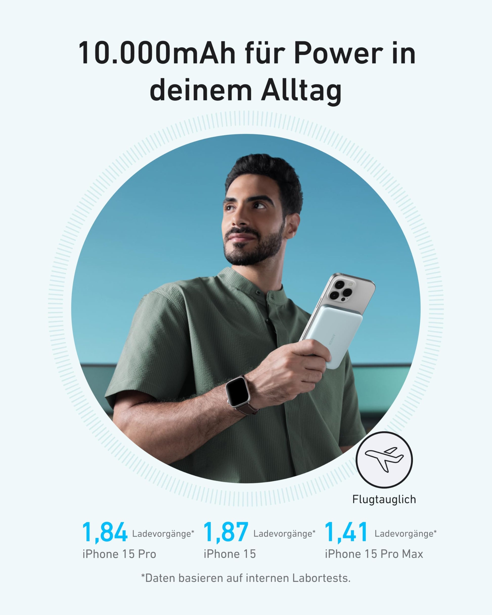 10.000 mAh mit hoher Kapazität: Diese Powerbank ist ideal für den Alltag sowie für Reisen geeignet und kann, dank ihrer hohen Kapazität, dein iPhone 15 bis zu 1,8 mal laden.