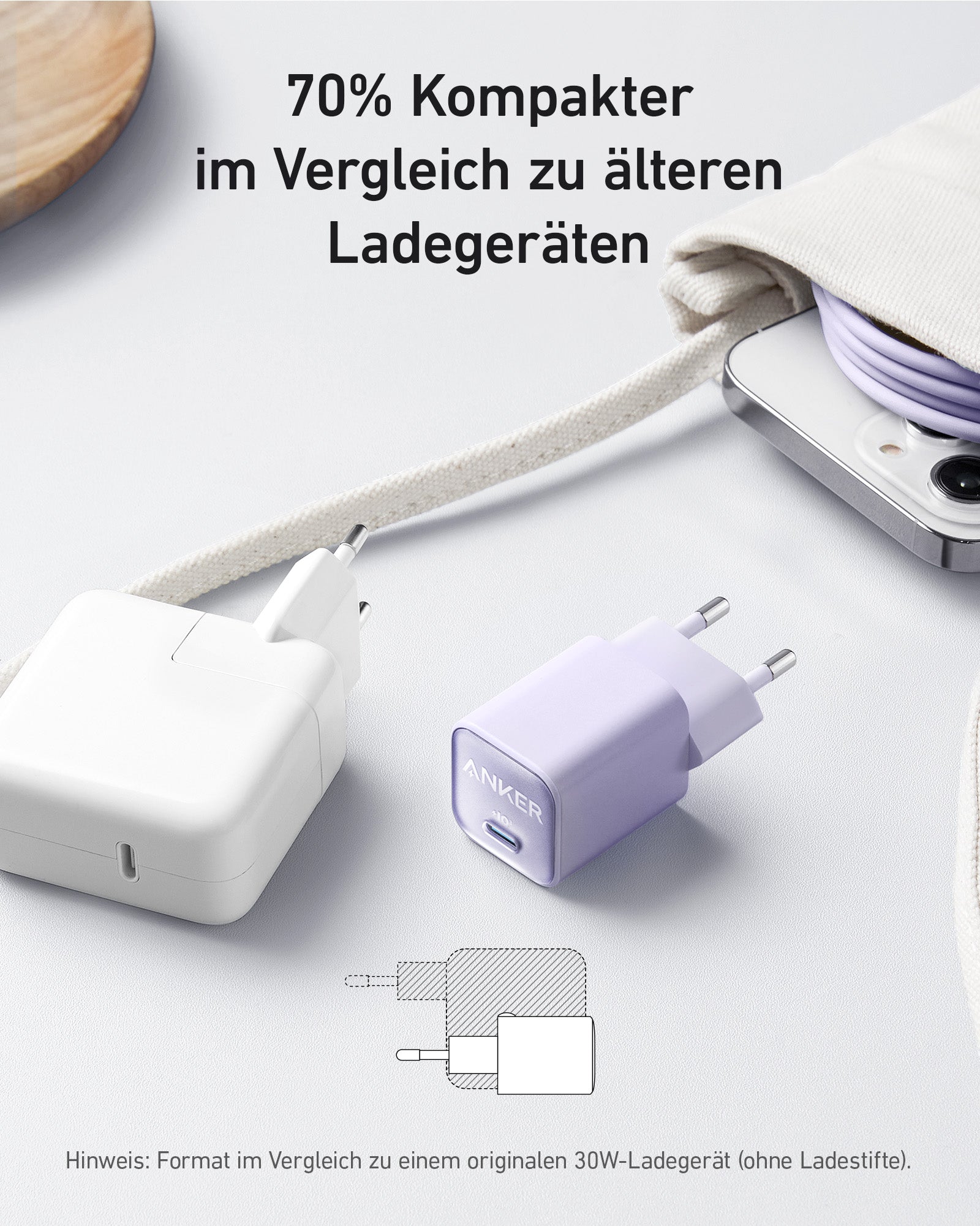 NEED FOR NANO: Aufgerüstet mit einer Ausgangsleistung von 30W, sodass du deine Ohrhörer, Smartphones, Tablets und sogar dein MacBook Air mit einem federleichten Ladegerät aufladen kannst.