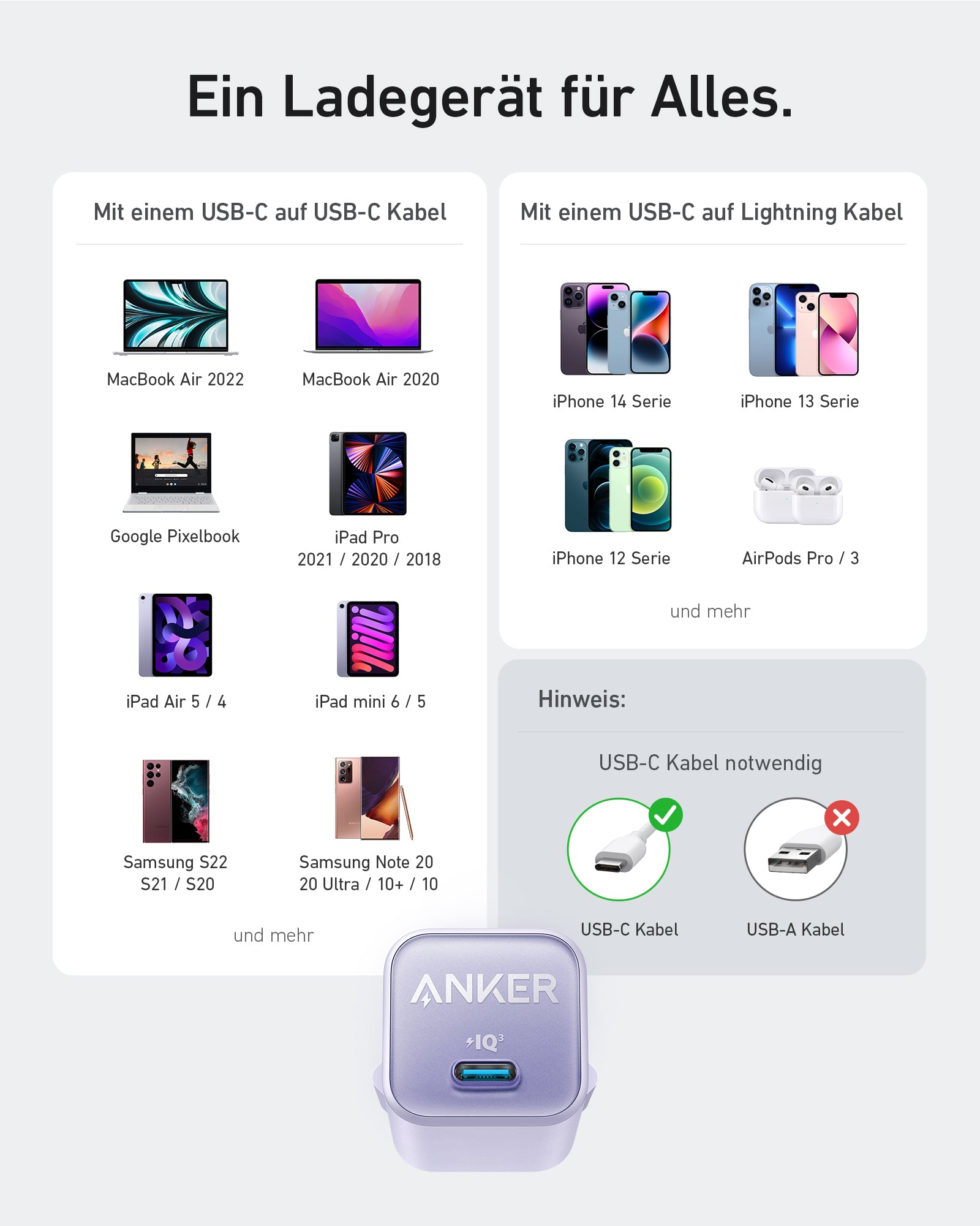 WAS DU BEKOMMST: Ein Anker 511 Ladegerät (Nano 3, 30W), eine Bedienungsanleitung, 24 Monate Herstellergarantie sowie freundlichen Kundenservice. (Ladekabel nicht im Lieferumfang enthalten.)