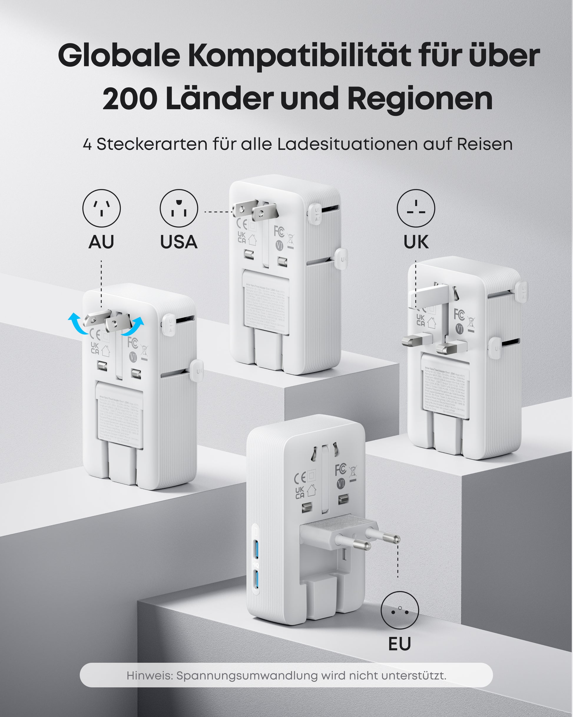 - Universelle Steckerkompatibilität: Der Adapter verfügt über vieer verschiedene Steckerarten (Typ A, Typ I, Typ G und Typ C), sodass du auch während interinationalen Reisen immer mit Strom versorgt bist. Hinweis: Spannungsumwandlundwird nicht unterstützt.