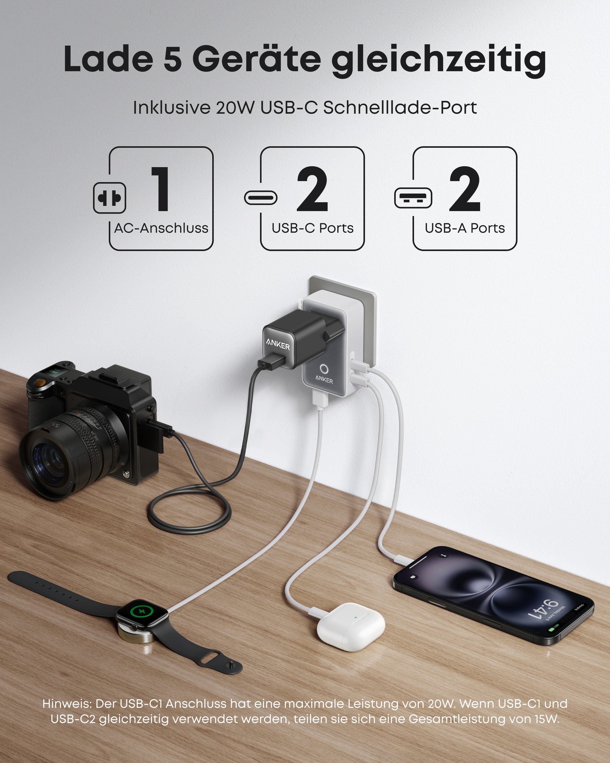 - Lade 4 Geräte gleichzeitig: Lade fünf Geräte zur selben Zeit mit 1x AC-Anschluss, 2x USB-A Ports und 2x USB-C Ports. Einer der USB-C Anschlüsse liefert bis zu 20W für effizientes Laden jederzeit. So bringst du dein iPhone 16 in nur 26 Minuten auf 50%.