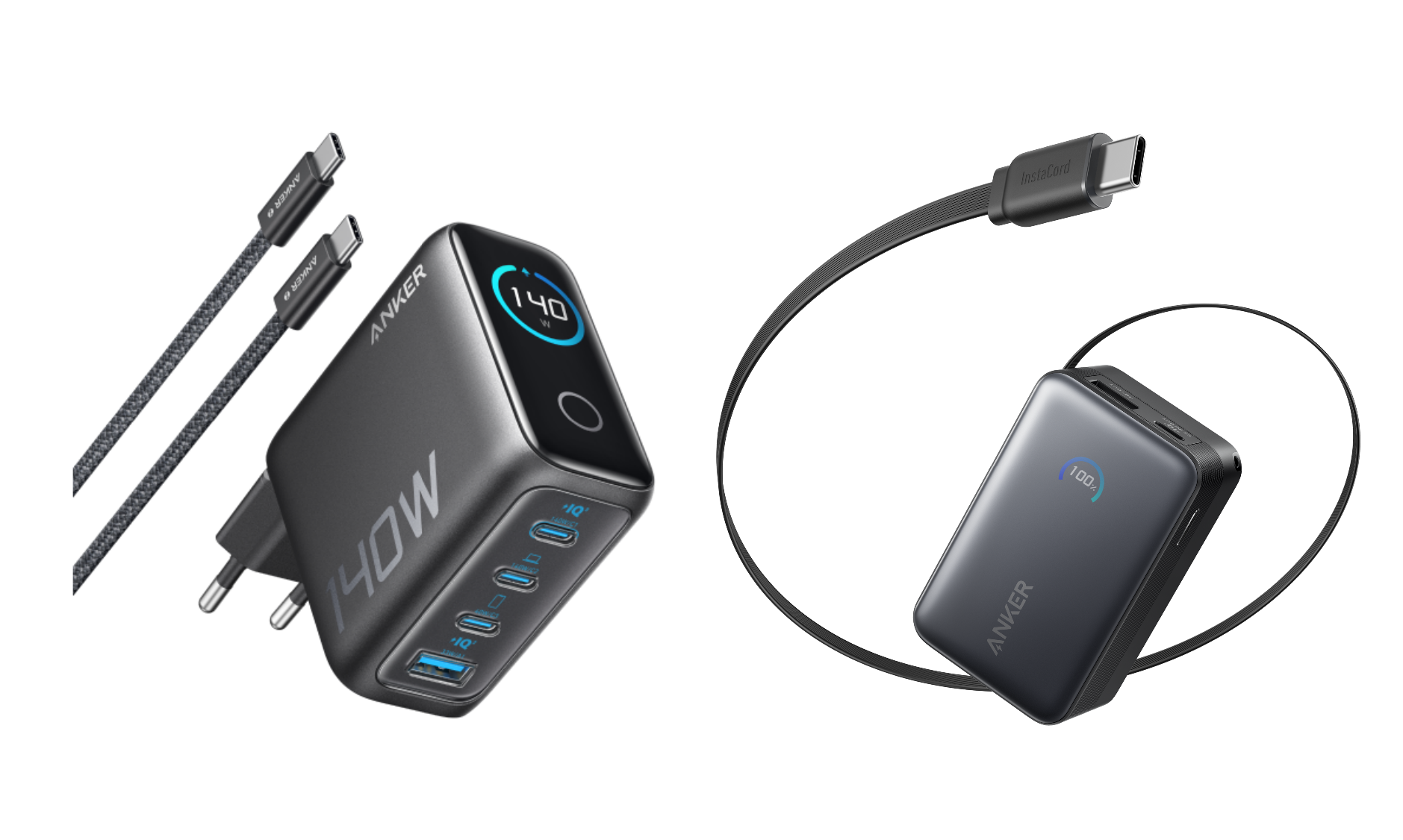 Anker Ladegerät (140W, 4-Port, PD 3.1) mit USB-C Kabel+Anker Nano Powerbank (10K, 45W, Integriertes einziehbares USB-C Kabel)